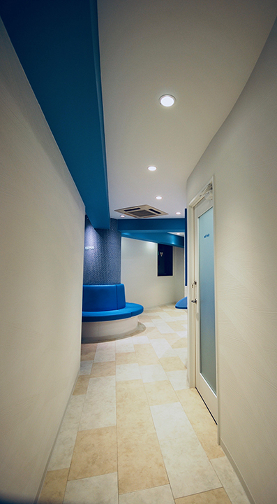 エレベーターから降りるとすぐに円柱があるためそれに青のタイルを貼り、円形ソファを作りそれを中心に壁を曲線にしてレイアウトを決めました。